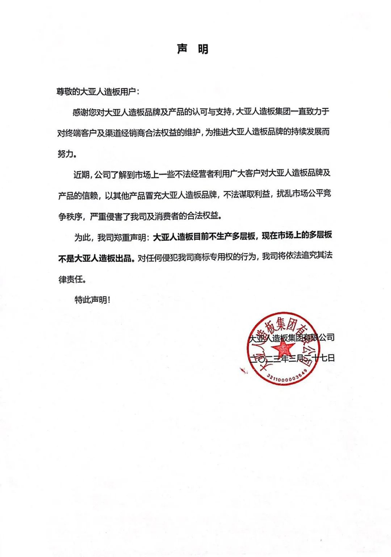 為此,我司鄭重聲明:大亞人造板目前不生產(chǎn)多層板,現(xiàn)在市場上的多層板不是大亞人造板出品。對任何侵犯我司商標專用權的行為,我司將依法追究其法律責任。
