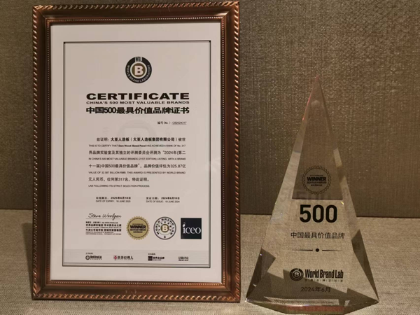 21屆世界品牌大會于6月19日在北京舉行。主辦方世界品牌實驗室(World Brand Lab)發(fā)布了2024年《中國500最具價值品牌》分析報告。在這份基于財務數(shù)據(jù)、品牌強度和消費者行為分析的年度報告中,大亞人造板以325.87億元品牌價值蟬聯(lián)中國500最具價值品牌排行榜,價值增幅6.6%!品牌排名317位,第七次榮登最具價值品牌(人造板行業(yè))榜首。