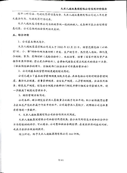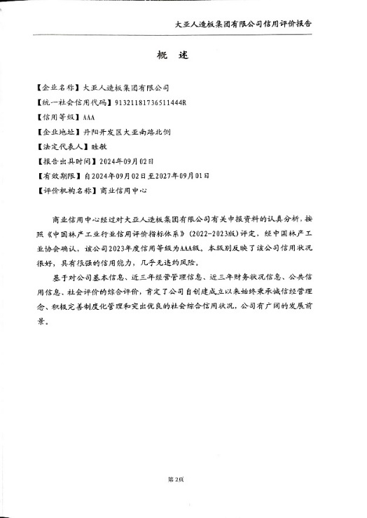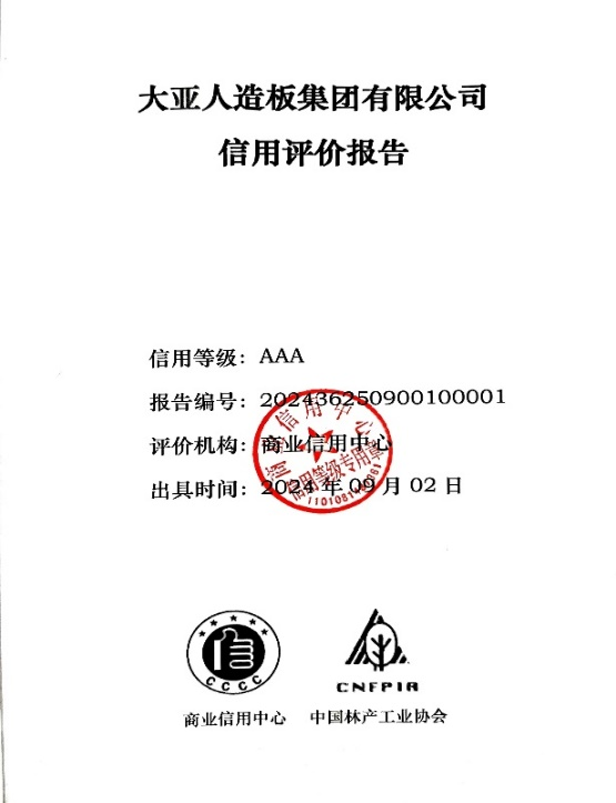 中國林產工業協會委托商業信用中心,對大亞人造板集團有限公司的信用狀況,按照《中國林產工業行業信用評價指標體系》做出“中國林產工業行業信用AAA級”的評定, 并將信用評價結果在中國林產工業協會官方網站、商業信用中心官網、國有企業采購供應信用管理平臺、公共資源交易主體信用服務平臺、行業信用信息服務等平臺上予以公示和發布。